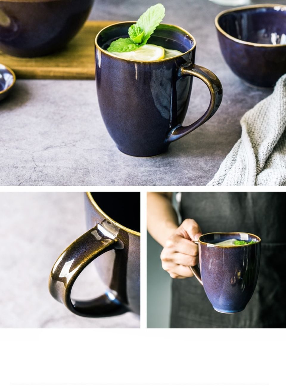 - The set is deep blue and color-coordinated with the entire tableware. The outer surface has a brown ombre tinge to it. The rims are gold brushed. Exquisite Nordic style crockery. Simple but not sappy.