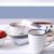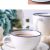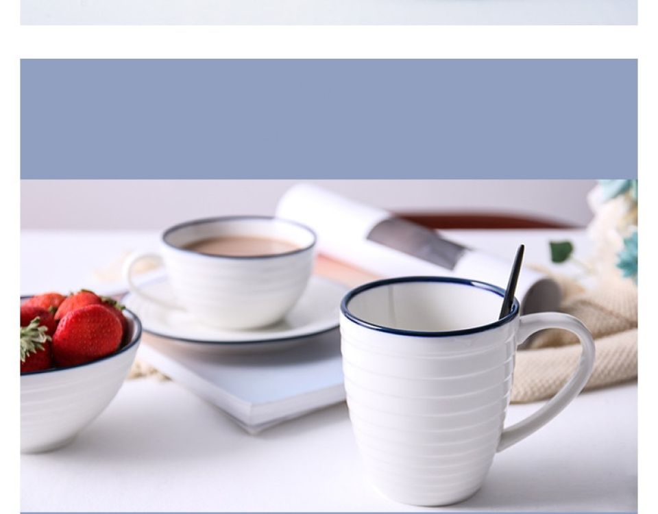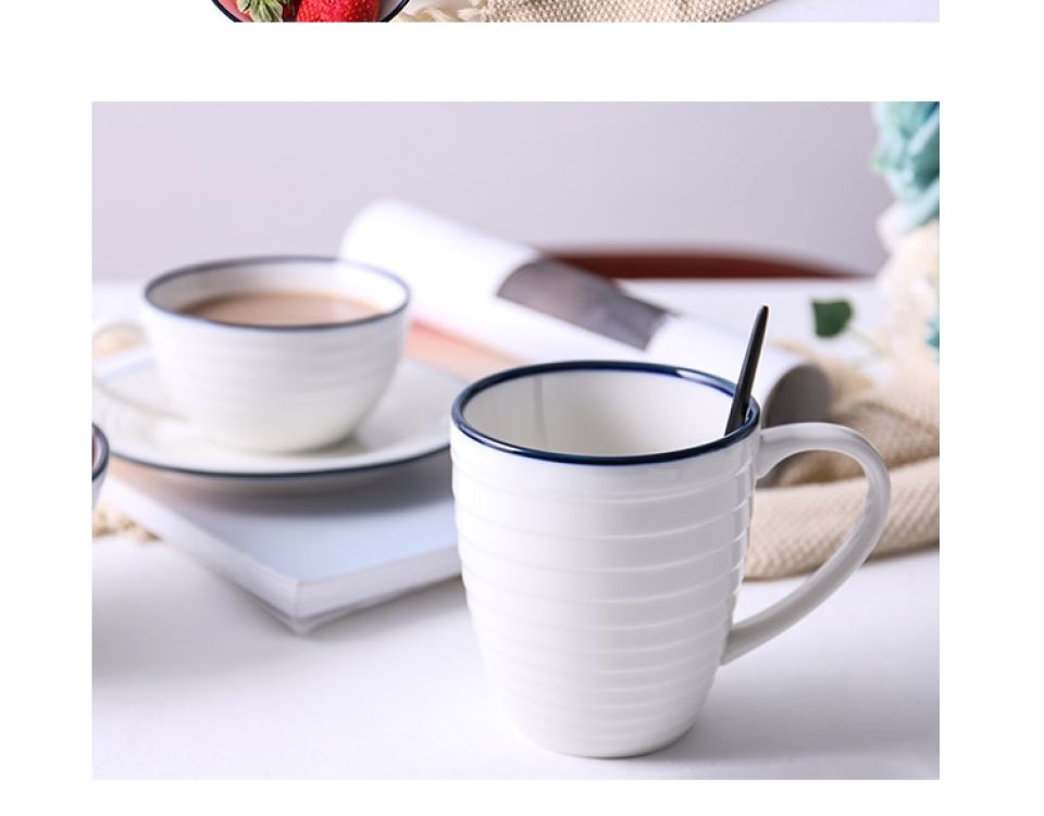- The set consists of a mug and a teacup along with its saucer. The set is snow white with a navy blue lining on the rims.