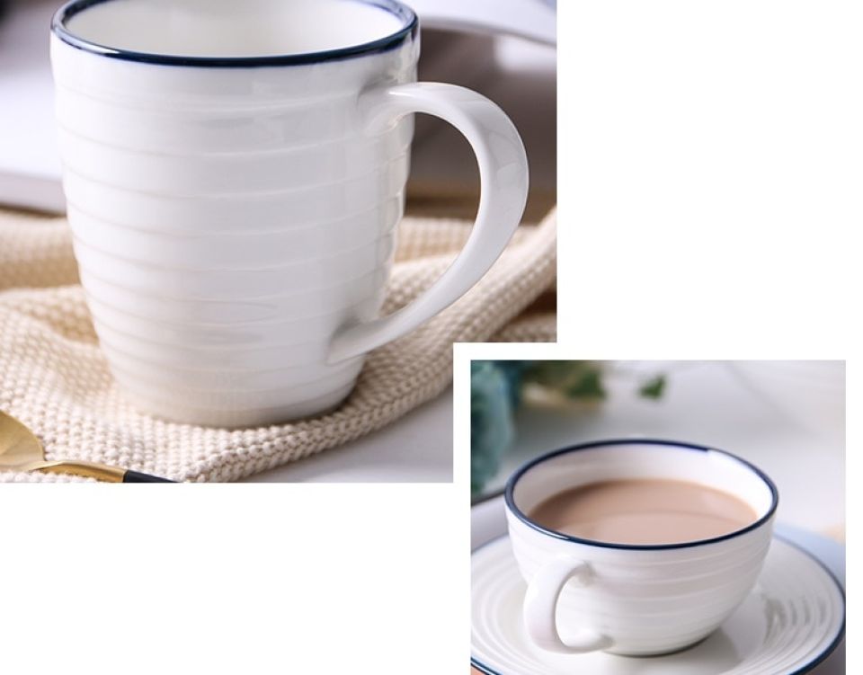 - The whole set contains raised lines to provide a texture and grip. The cup and the mug are hand-gripped. The saucer has a decent depth to hold the cup base within it.