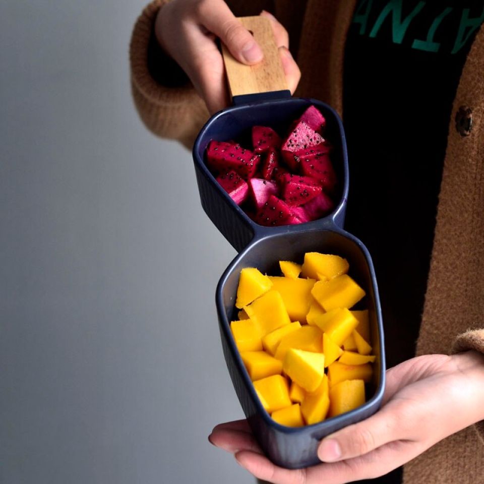 - Who said crockery cannot be stylish? If your clothes speak of fashion, your crockery should too. Have a look at this divided snack bowl with a wooden handle and tell us if you are already drooling over it. This hexagonal ceramic bowl has a divider in between to give you the convenience of 2 bowls in one. Since it is made of ceramic, you can use it on your oven and in your microwave. The wooden handle makes sure that your hands are insulated and provides you protection against heat. If you are not a big fan of fruits, serve it in this bowl and see your appetite craving for it. If your guests show up at the last minute and you don’t have anything presentable, serve some cookies and cake in this 2 in 1 bowl. When your guests leave, they will definitely ask about this beauty and where you got it from.
