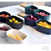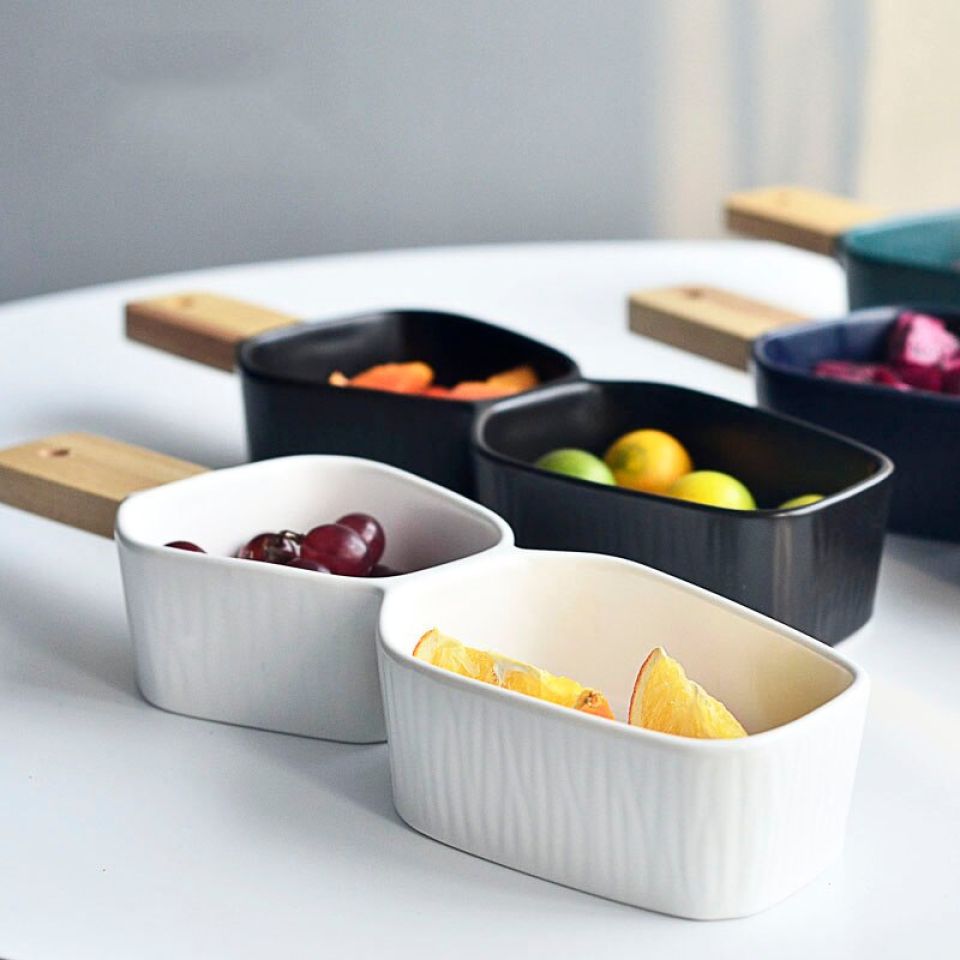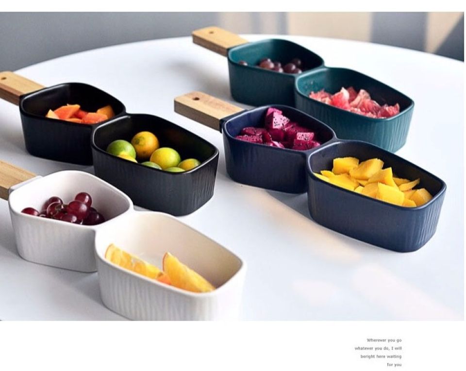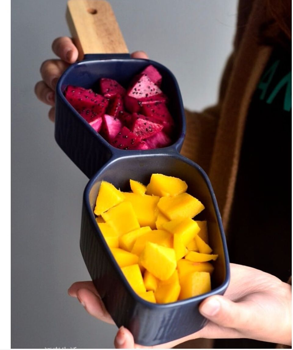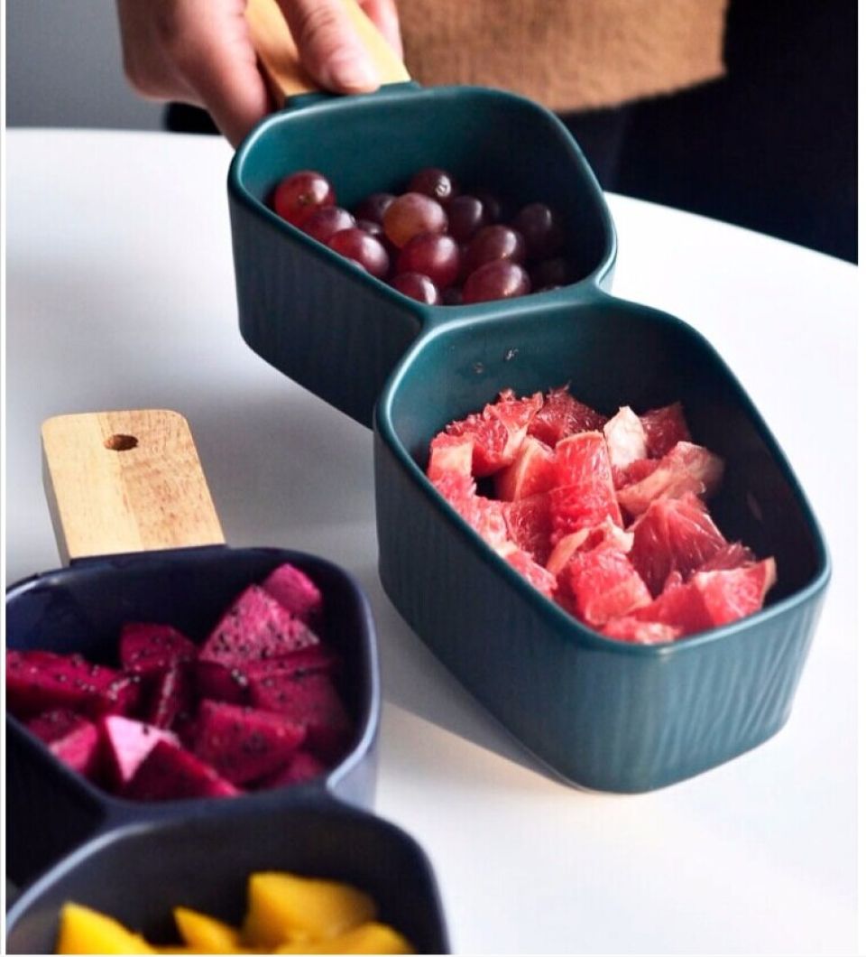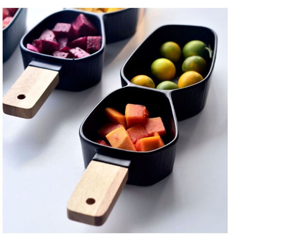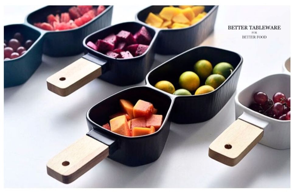 - Who said crockery cannot be stylish? If your clothes speak of fashion, your crockery should too. Have a look at this divided snack bowl with a wooden handle and tell us if you are already drooling over it. This hexagonal ceramic bowl has a divider in between to give you the convenience of 2 bowls in one. Since it is made of ceramic, you can use it on your oven and in your microwave. The wooden handle makes sure that your hands are insulated and provides you protection against heat. If you are not a big fan of fruits, serve it in this bowl and see your appetite craving for it. If your guests show up at the last minute and you don’t have anything presentable, serve some cookies and cake in this 2 in 1 bowl. When your guests leave, they will definitely ask about this beauty and where you got it from.
