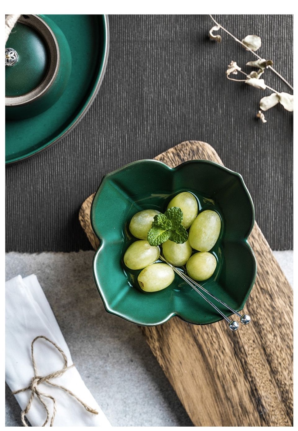 - The bigger bowl is pine green but with a quirky design. The bowl is shaped like a 4-clover leaf! It has an elevated stand beneath (also green in color). This bowl has greater depth than the round ones.Â