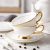 The white cup is bordered with gold inlays. The handle, rims, and base stands are golden.Â