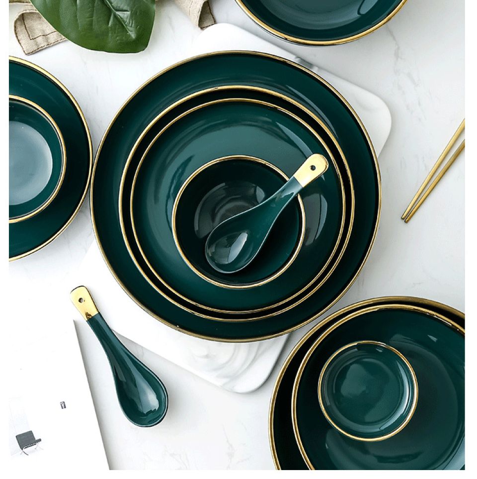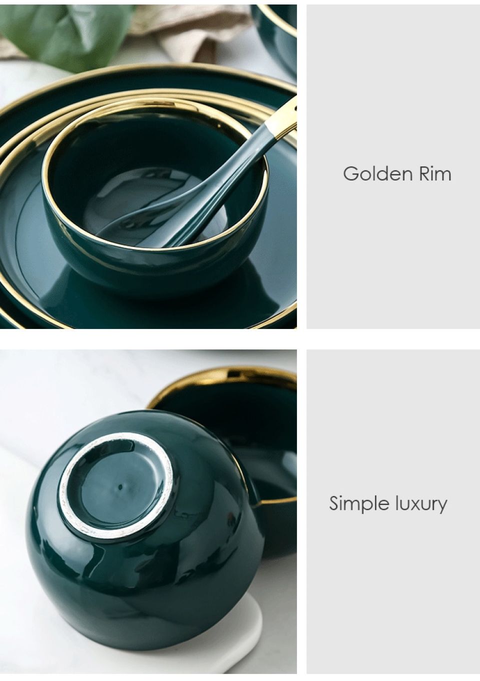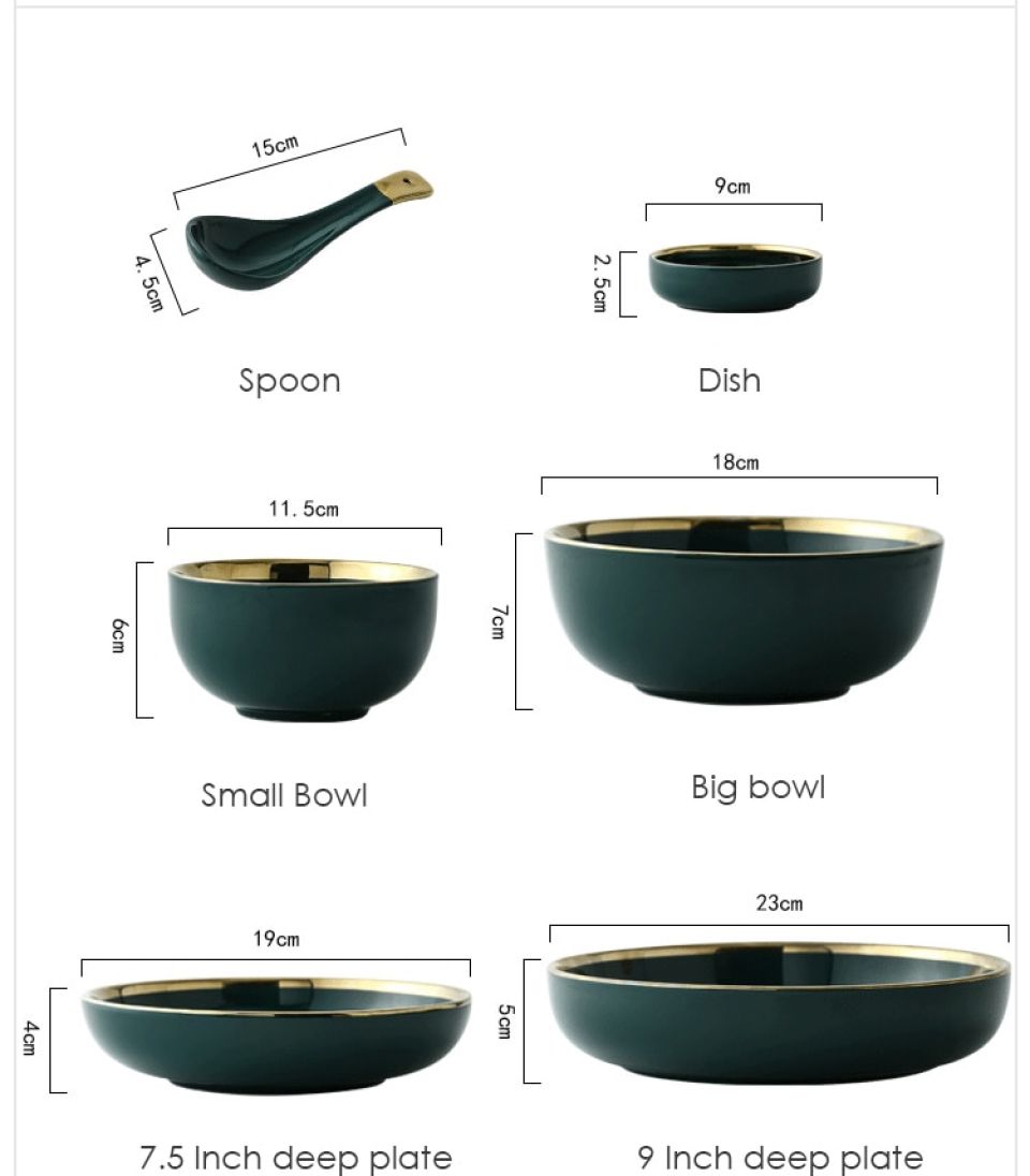 The set comes in a plush green color with muted golden lining at the edges. These pieces are eternal and will add a spark to your kitchen that shall last forever. If your guests are coming over, serve those three-course meals in this set and you can hear compliments rushing in. Since the set is composed of ceramic material, you can safely use it in your microwave oven. These pieces are much more than a luxuriant display, they are very functional and easy to use. Our set comes with cutlery of every shape and size to fit in all the meals that you cook. If you have not yet realized, let us remind you. This set will make a perfect gift for your friends and loved ones.Â