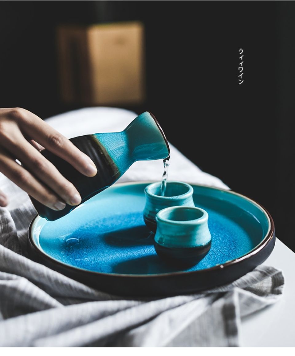 - The set consists of a bottle, 2 or 4 wine cups, and a base plate. All of them are Lake Blue and matte black with colored intricacies on the surface. A three-dimensional sensational beauty!