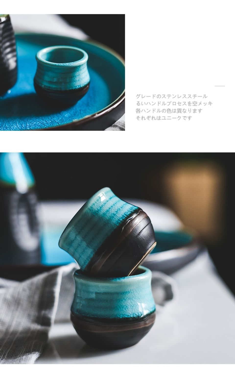 • The set consists of a bottle, 2 or 4 wine cups, and a base plate. All of them are Lake Blue and matte black with colored intricacies on the surface. A three-dimensional sensational beauty!