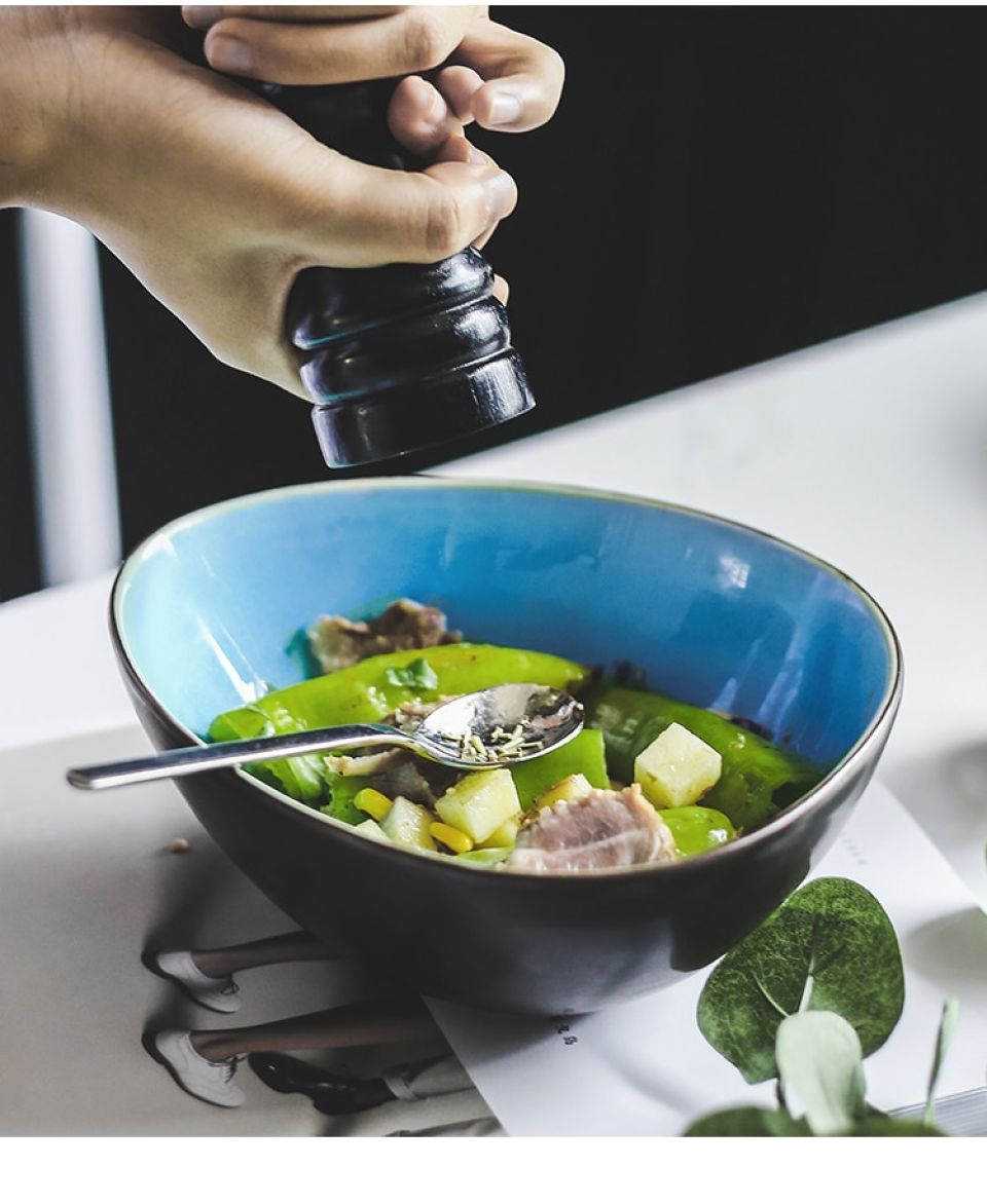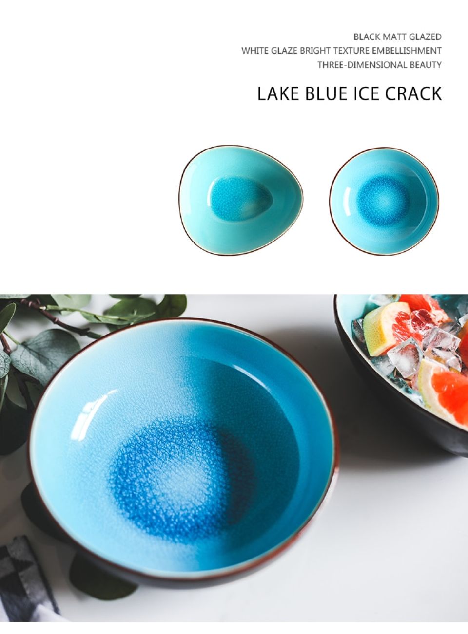 - We all like Japanese food. How about introducing some crockery inspired by the Japanese tradition? Have a look at our Lake Blue Japanese Bowl. It has an ice-crack decorative pattern which gives it a mysterious and appealing look. It is the perfect bowl for garnishing your meals and making them picture perfect. And you know the best part? The bowl comes in five different shapes. If you want to keep it simple, you can go for the typical oval shape. But if you want to spice up your dining table, you might choose the triangular shape. This bowl is ideal for serving Japanese dishes, which you can enjoy with your family and friends.Â