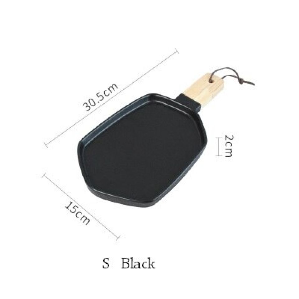 - Keeping your needs in mind, we have two different sizes for this plate- Small and Large. It comes in four neutral colors that will complement your kitchen irrespective of your background. Since it is provided with a wooden handle, you can hold a firm grip and flip your steak easily. Often steaks and omelets get messed up because of the narrow surface area of a cooking pan. But this plate will solve such worries. It has a large, flat base with curved edges that will not only make flipping easier but also prevent your meal from spilling. And you know the best part? You can cook and serve your steak on this very plate because it will make your dish more elegant and save you the trouble of washing separate dishes.