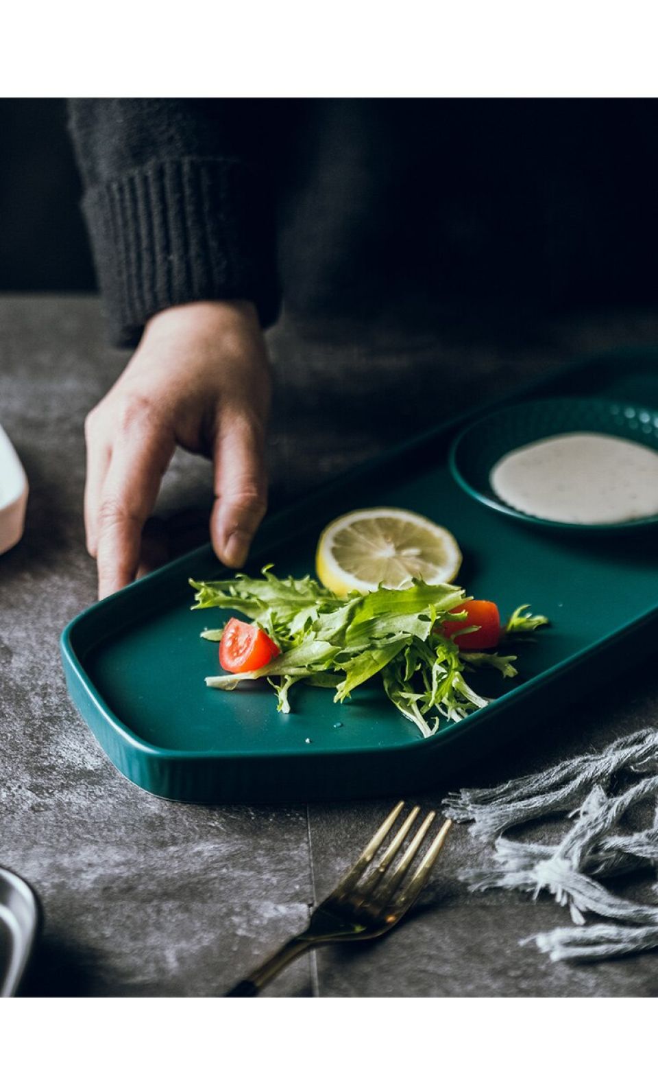 - The plate is available in 4 colors- seaweed green, navy blue, black, and white. All the colors are essential for balance and provide a great background for a luxe-looking meal.