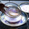 - How about adding a little color to your kitchen? Take a look at our Premium Gold Lined Bowl and Serving Plate. These unique crockery have a transparent body with frosty rainbow colors dispersed throughout. They are nothing less than magical and might even transform you into the fairy world. The glass pieces might look delicate but are sturdy enough to last you for several years. The bowl and serving plate come in three different sizes- Large, Medium, and Small. This set can make even the most boring food look amazing without any effort.