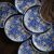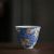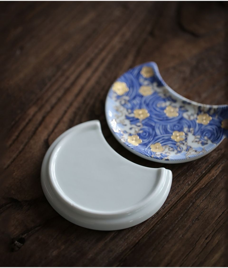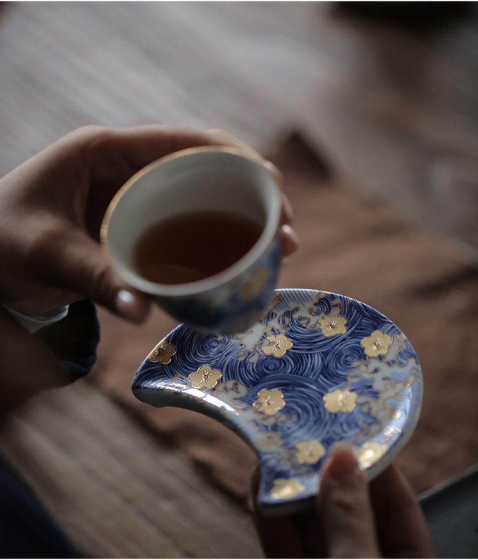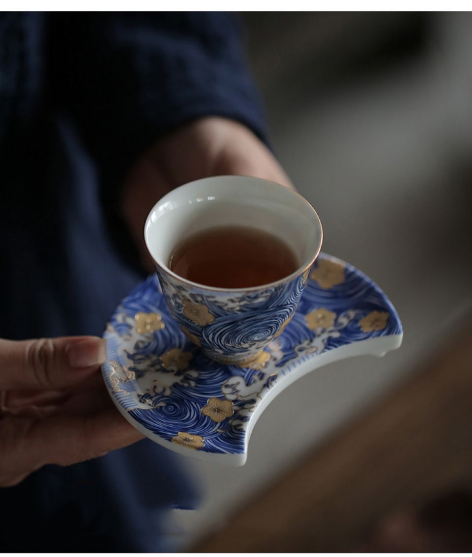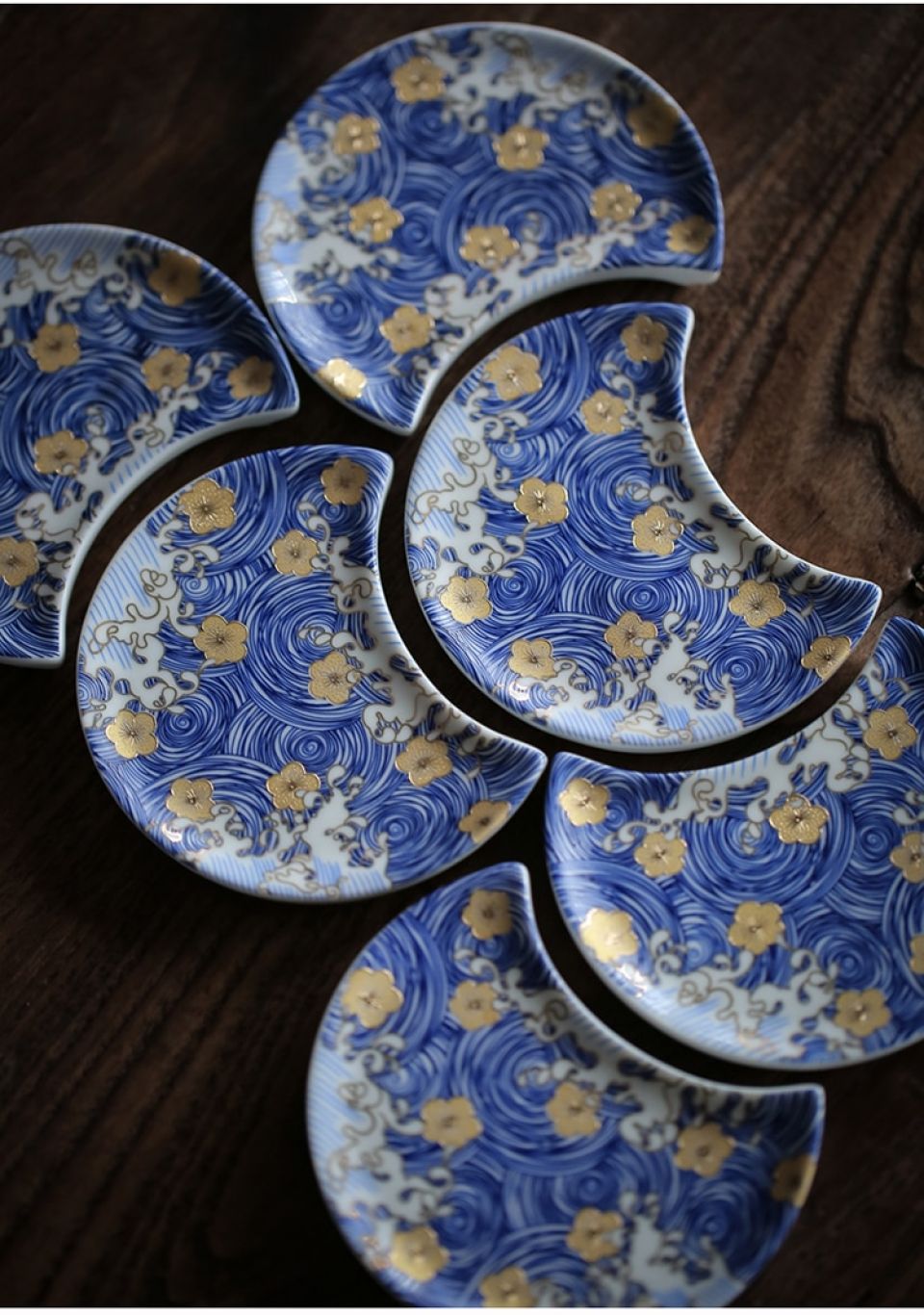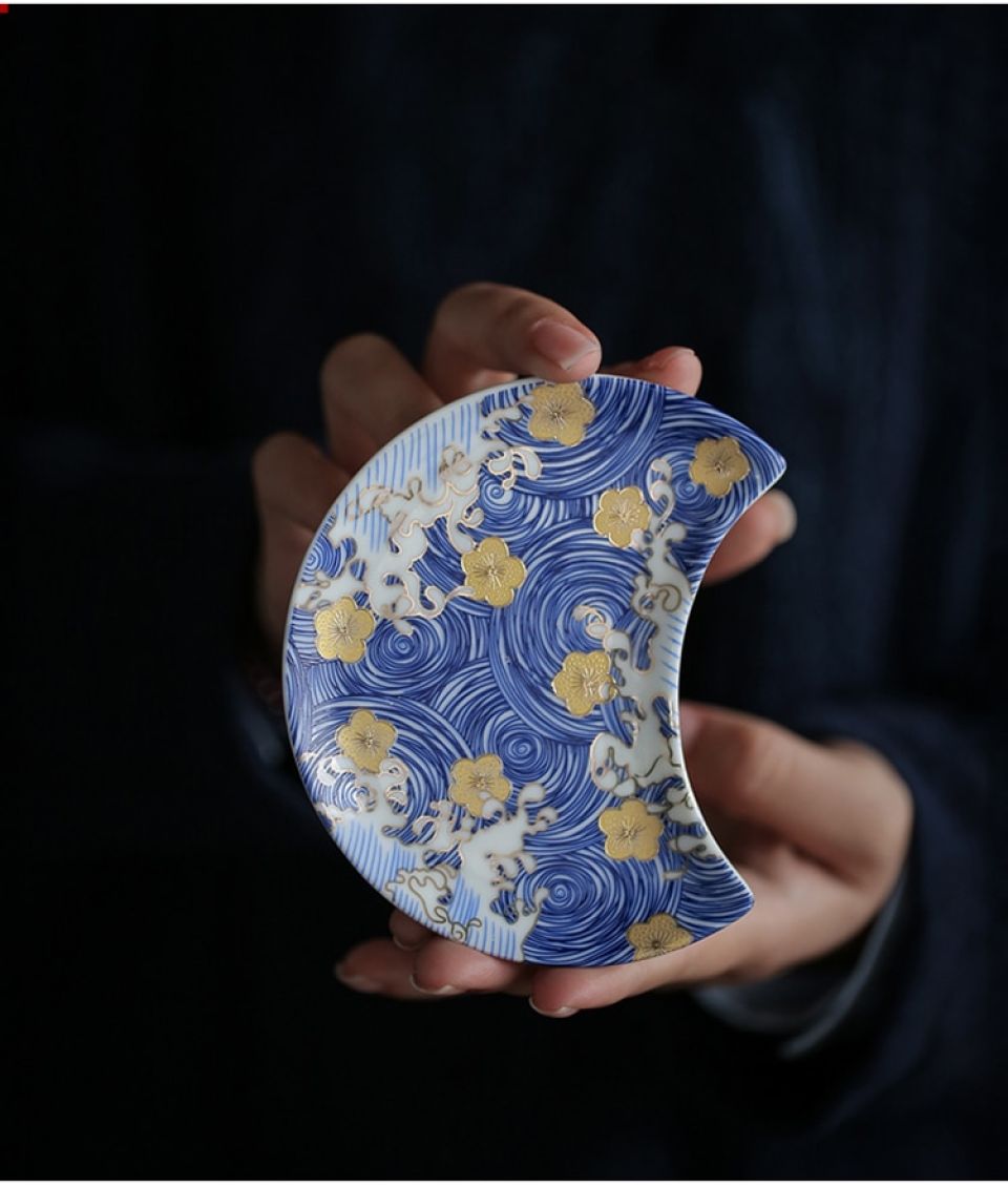 - The set has a blue and white floral design. A unique pattern for a cup set. The saucer is shaped like a crescent moon, hence the name. The cup has no handles.