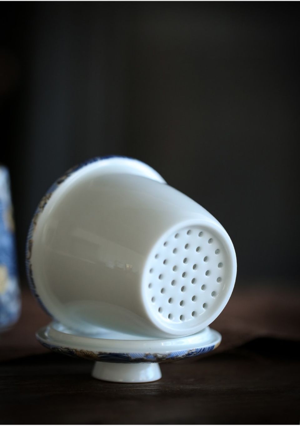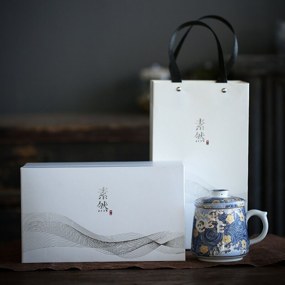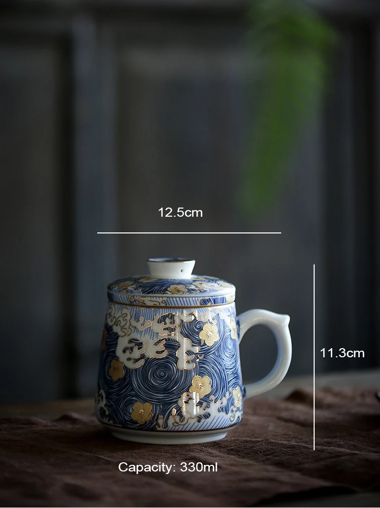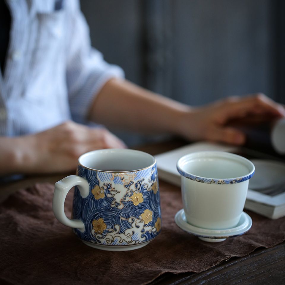 Beautiful bone china cup with sieve and flat lid. Arrives in great gift box! Cup is much larger than needed, probably holds 12 oz, when 8 oz would suffice for common hot tea and/or coffee serving. Dishwasher safe.