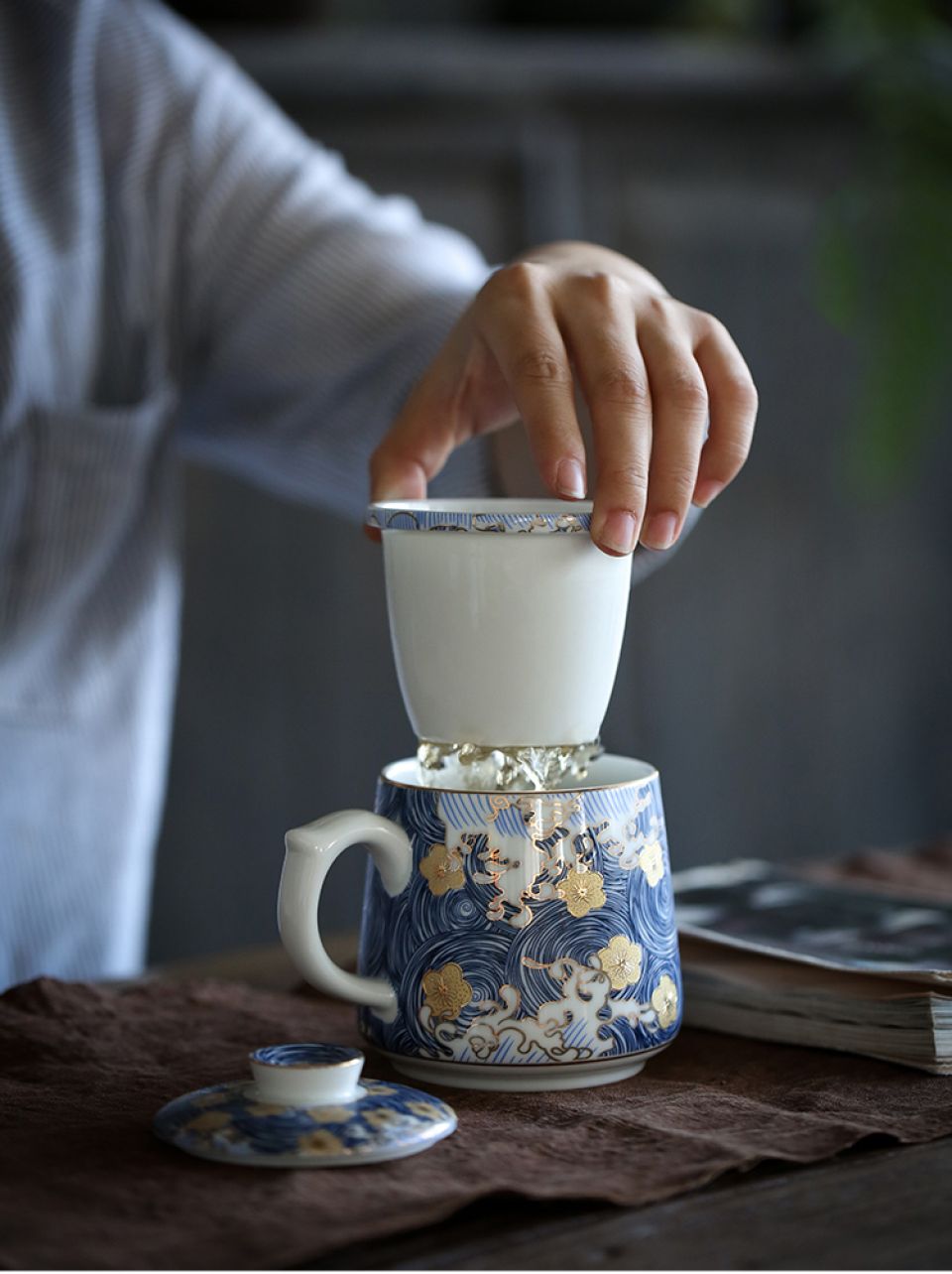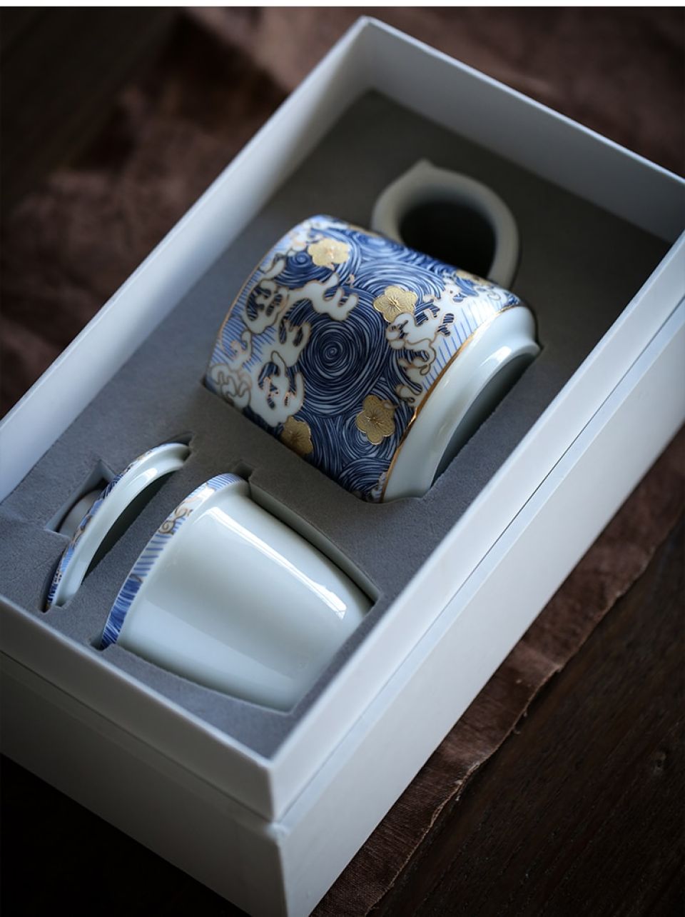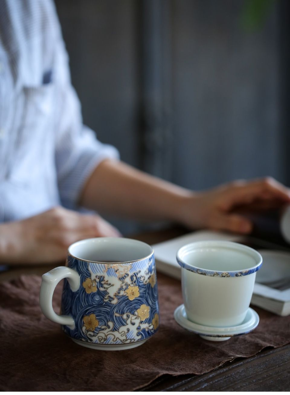 Beautiful bone china cup with sieve and flat lid. Arrives in great gift box! Cup is much larger than needed, probably holds 12 oz, when 8 oz would suffice for common hot tea and/or coffee serving. Dishwasher safe.
