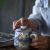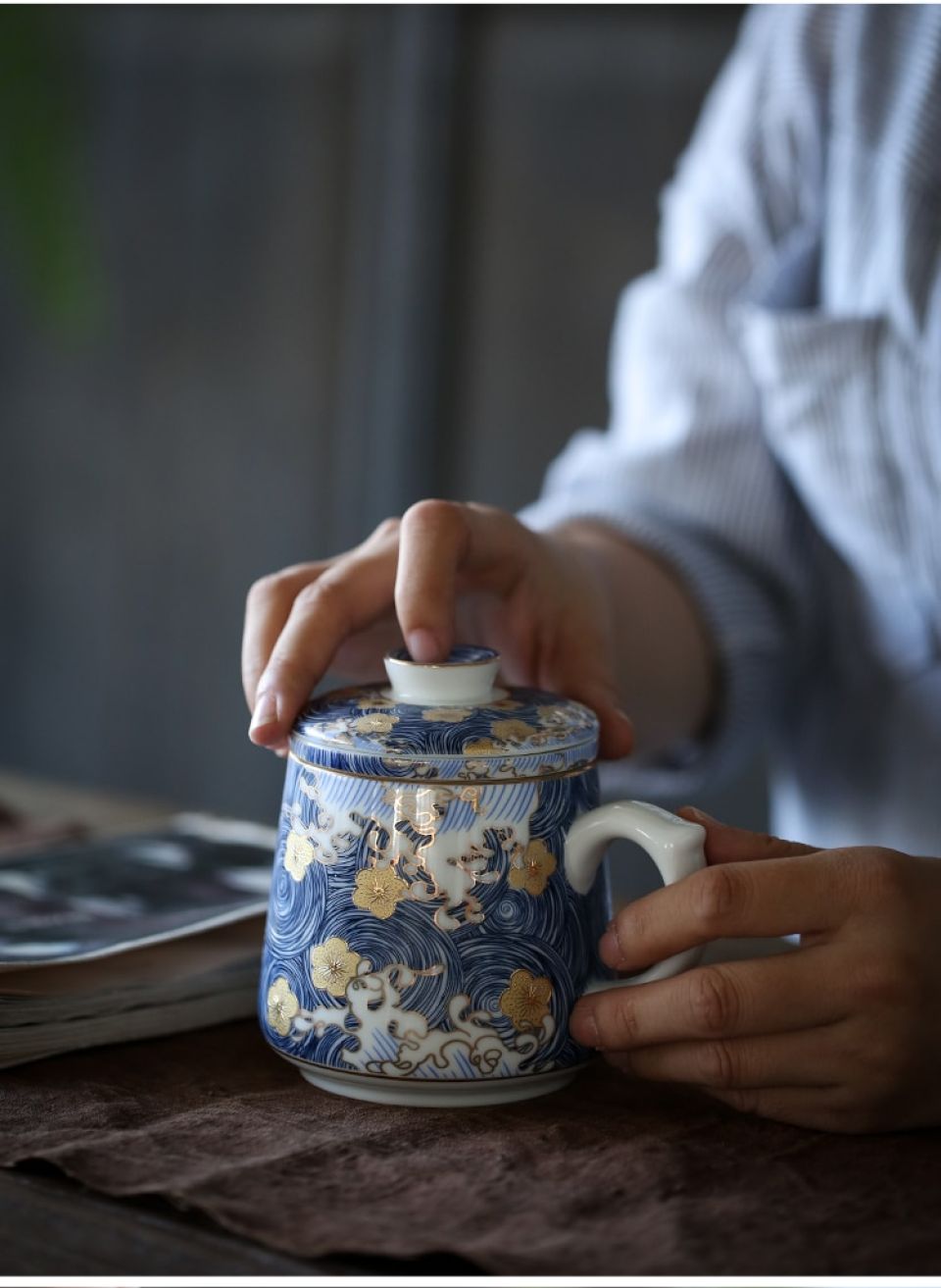 I favor the McIntosh Old Masters coffee mug for creative writing throughout the day. It holds a generous 10 ounces of coffee, with room for cream, and is very comfortable to the hand and wrist while I’m at my keyboard. Lightweight and beautiful, it also comes with a brewer basket for loose tea and a lid that holds the heat and doubles as a caddy for the tea basket. When mine broke, I immediately went online to find a replacement.